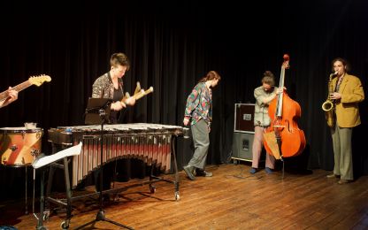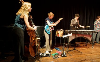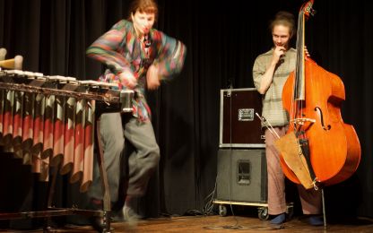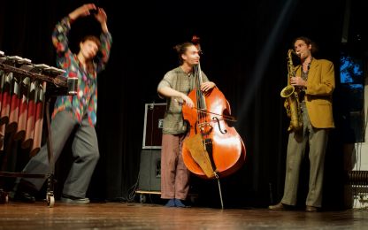 "Dazwitschern" ist so etwas wie ein Arbeitstitel für ein Spiel zwischen Musik und Tanz, zwischen Komposition und Improvisation, zwischen Individualismus und dem Verschmelzen zu einem großen Ganzen. Die Besetzung mit zwei Kontrabässen, Vibraphon, Gitarre, Saxophon und Tanz eröffnete immer wieder unerwartete Horizonte. Dabei wechselten sich schwelgende Melodien mit elektrisierenden Rhythmen und abstrakten Klangskulpturen ab, präzise mit perfektem Timing gespielt und getanzt. Selbst eine gerissene Gitarrensaite brachte das Konzept nicht durcheinander – sie wurde im Rahmen der improvisatorischen Möglichkeiten routiniert getauscht – so als wenn es zum Programm gehören würde.
