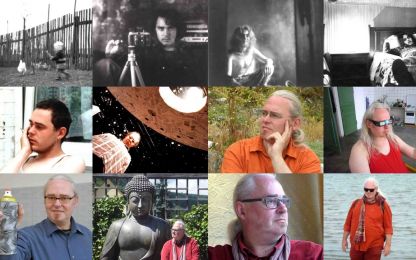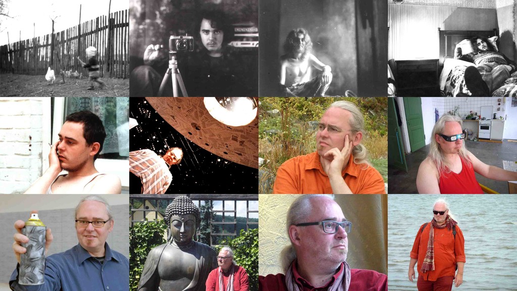 Der multimedial arbeitende Künstler Harald Hilscher sieht sich auf diese Weise, zeitlebens. Seine Foto-Installation besteht aus einer lebenschronologischen Abfolge von Selbstportraits, vom analogen Schwarz-Weiß-Foto, über das digitale Farbbild bis hin zum Handy-Selfie. Lebens-Epochen markierend, in verschiedensten Alltags- und Arbeitssituationen aufgenommen, bilden sie eine zyklische Lebens-Sichtung. Sie zeigt die labile Stellung der Person zwischen Selbstvergewisserung und Fremdwahrnehmung, zwischen Identität und Identifikation.