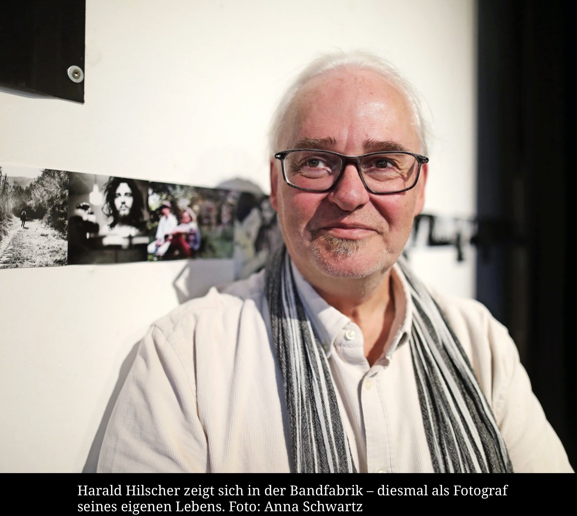 Der Künstler Harald Hilscher hingegen bedient sich in seiner Ausstellung „Selbstsichten – Ein fotografischer Lebensfilm“, die bis 26. Oktober in der Bandfabrik in Langerfeld zu sehen ist, ausschließlich der Fotografie und ihrer technischen Entwicklung in den letzten Jahrzehnten. Chronologisch nach Lebensphasen geordnet, bilden seine Fotos einen Zeitstrahl entlang der Wand, der ihn in verschiedenen Alltagssituationen zeigt.